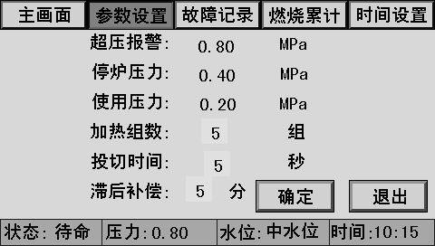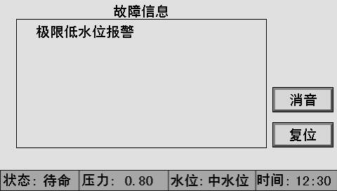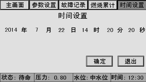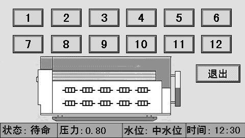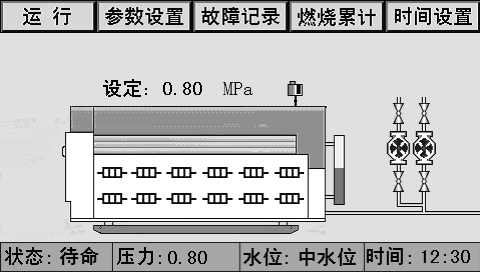 主畫面上同時顯示控制器狀態(tài)、系統(tǒng)壓力、水位、時間、燃燒器狀態(tài)、泵狀態(tài)等。