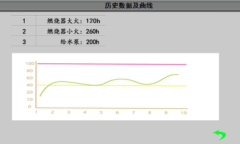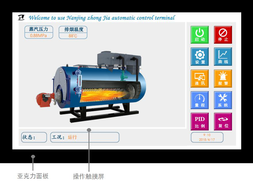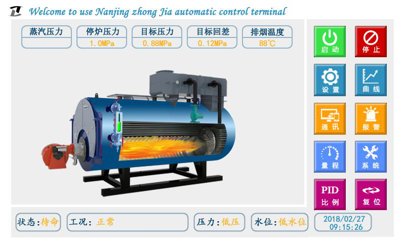 在鍋爐的上方顯示當(dāng)前鍋爐的出口溫度、進(jìn)口溫度或蒸汽的壓力狀況(壓力 變送器顯示壓力值)以及排煙溫度等。在鍋爐的左側(cè)是鍋筒水位的模擬水位計(jì),顯示鍋筒水位的狀態(tài)。 2.4 參數(shù)設(shè)置及數(shù)據(jù)查閱 該自控終端采用全觸摸功能操作,根據(jù)功能需要觸摸對(duì)應(yīng)的功能按鍵: