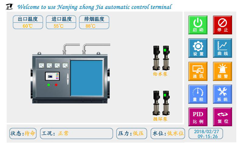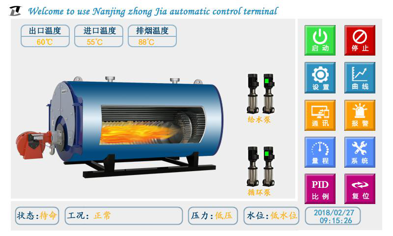 在屏幕正下方顯示控制器的工況。工況包括定時(shí)信息和燃燒器狀態(tài)。非報(bào)警狀態(tài)下,無定時(shí)顯示 “無定時(shí)”,有定時(shí)顯示“啟動(dòng)時(shí)段”或“停止時(shí)段”;報(bào)警狀態(tài)下顯示具體的報(bào)警信息。屏幕上同時(shí)顯示燃燒器(加熱組)、補(bǔ)水泵(給水泵)、循環(huán)泵(冷凝泵)的工作狀態(tài),水泵的 主備狀態(tài)和手自動(dòng)狀態(tài)。