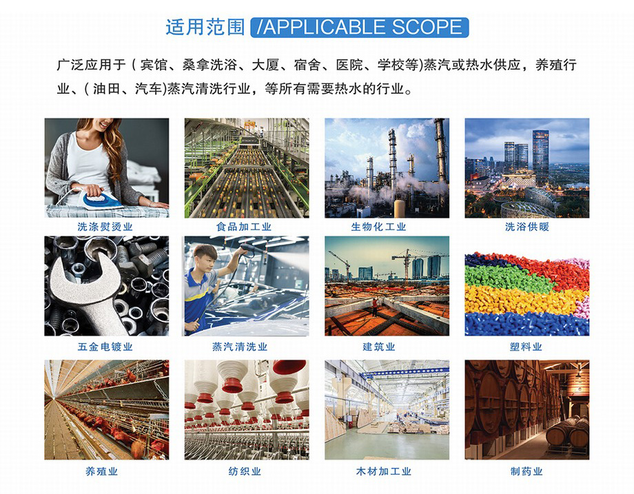 水泥房蒸養(yǎng)、釀酒、飲料瓶殺菌、醫(yī)療器械消毒、調(diào)味品蒸煮、食品烘干、糧食制品烘干、水泥構(gòu)件蒸養(yǎng)、輕工業(yè)加熱、地下倉庫供暖、車間供暖、油罐清洗、除雪、蒸汽洗車、一次性紙杯制作、化工企業(yè)、制藥企業(yè)。
